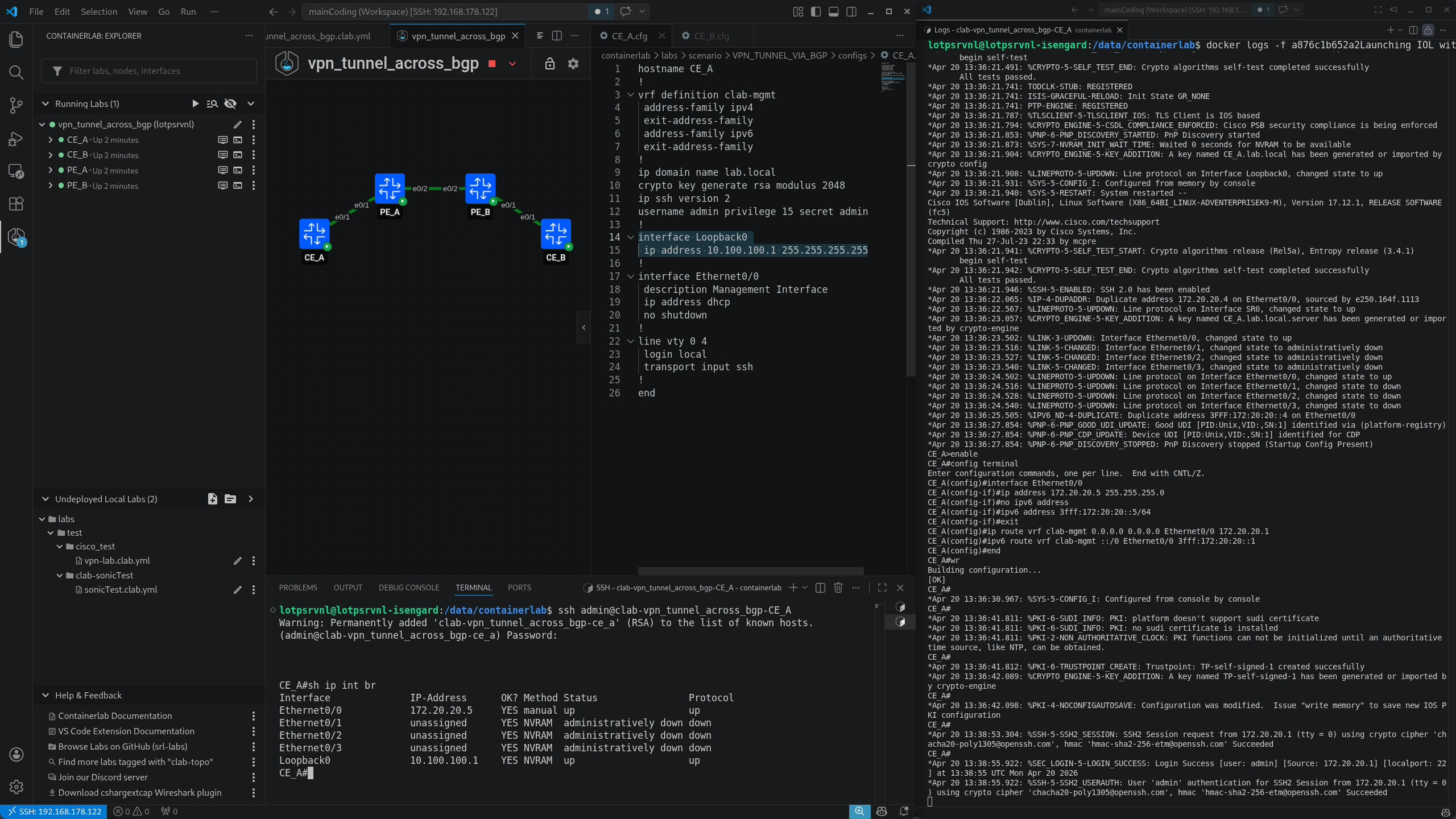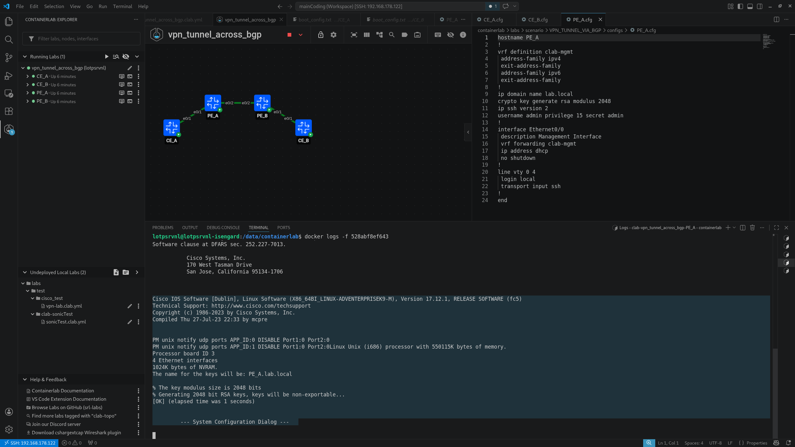 I didn’t thought to preventively create a Loopback in this VPN lab. But since this was the only one difference, i’ve tried to apply a Loopback with an IP to the CE_A and it worked, the startup-config was not skipped anymore and i was able to ssh the IOL image.